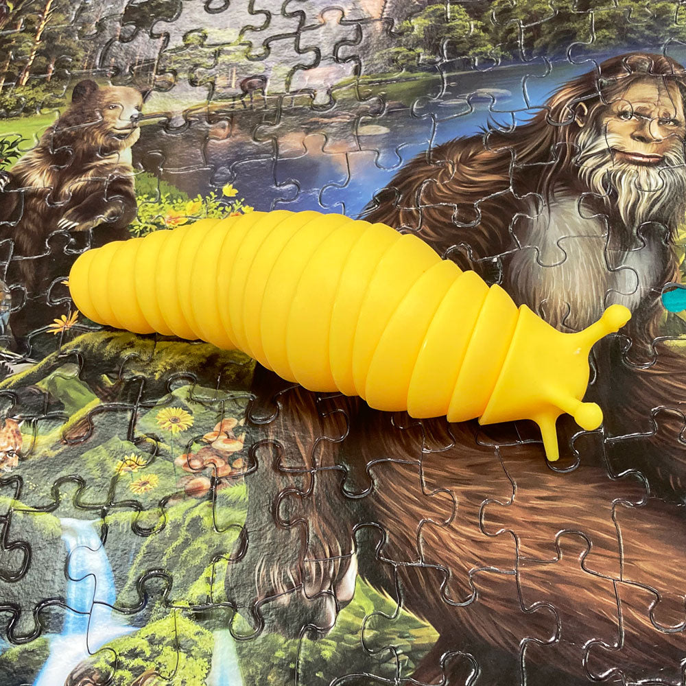 An articulating banana slug toy to entertain and relieve stress for all ages. It makes a soothing sound like rain when you move it