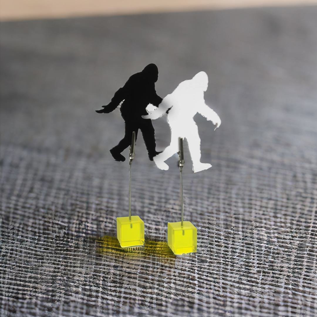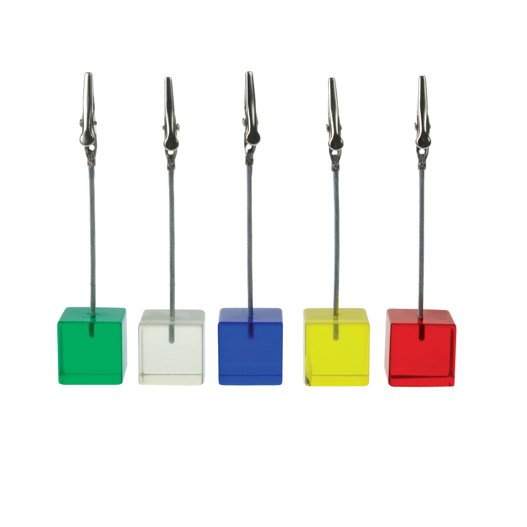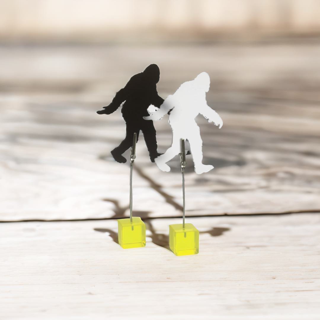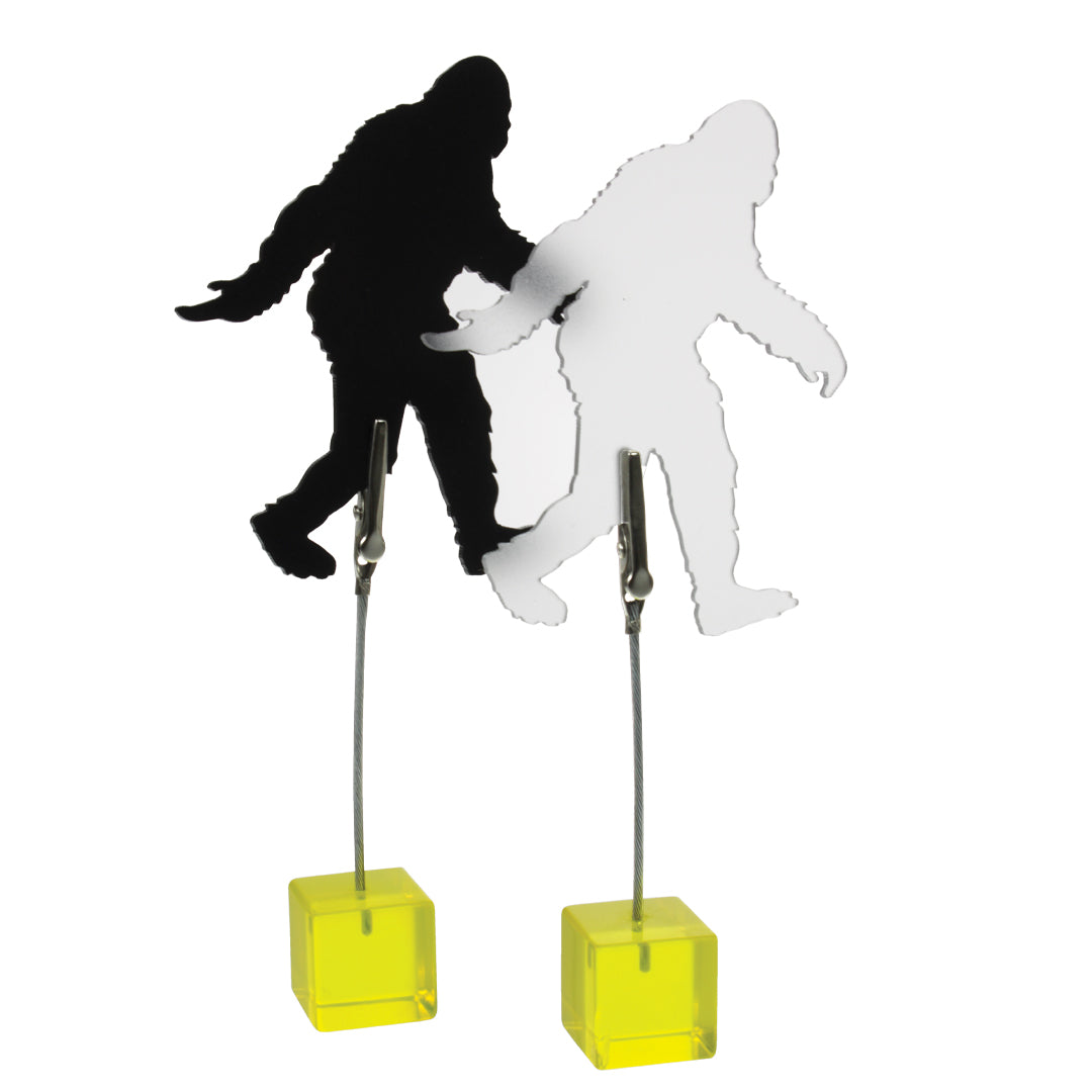 The flat base makes it easy to place on any counter or tabletop. The set includes 6 Sasquatch cut-outs and Acrylic Block clips. The Acrylic Block clips come in an assortment of colors. We have red, blue, green, yellow, and clear.