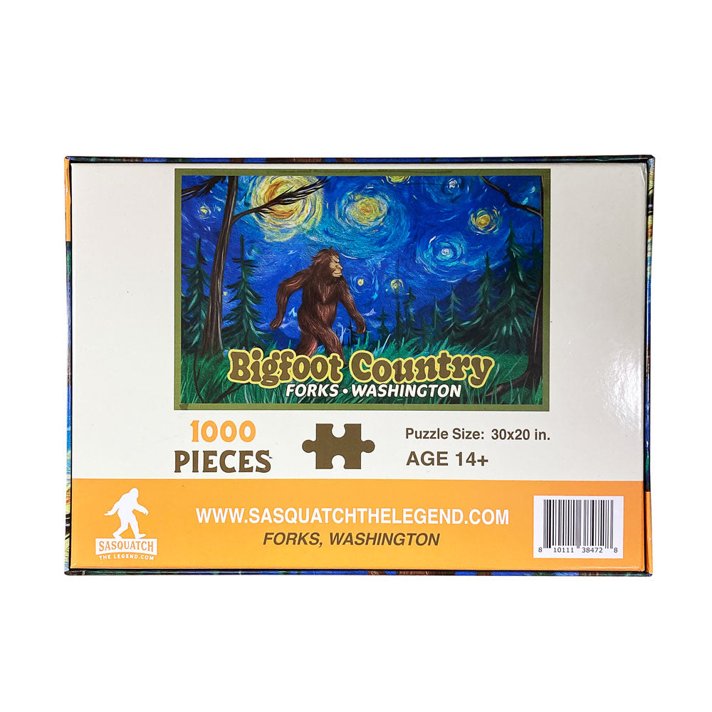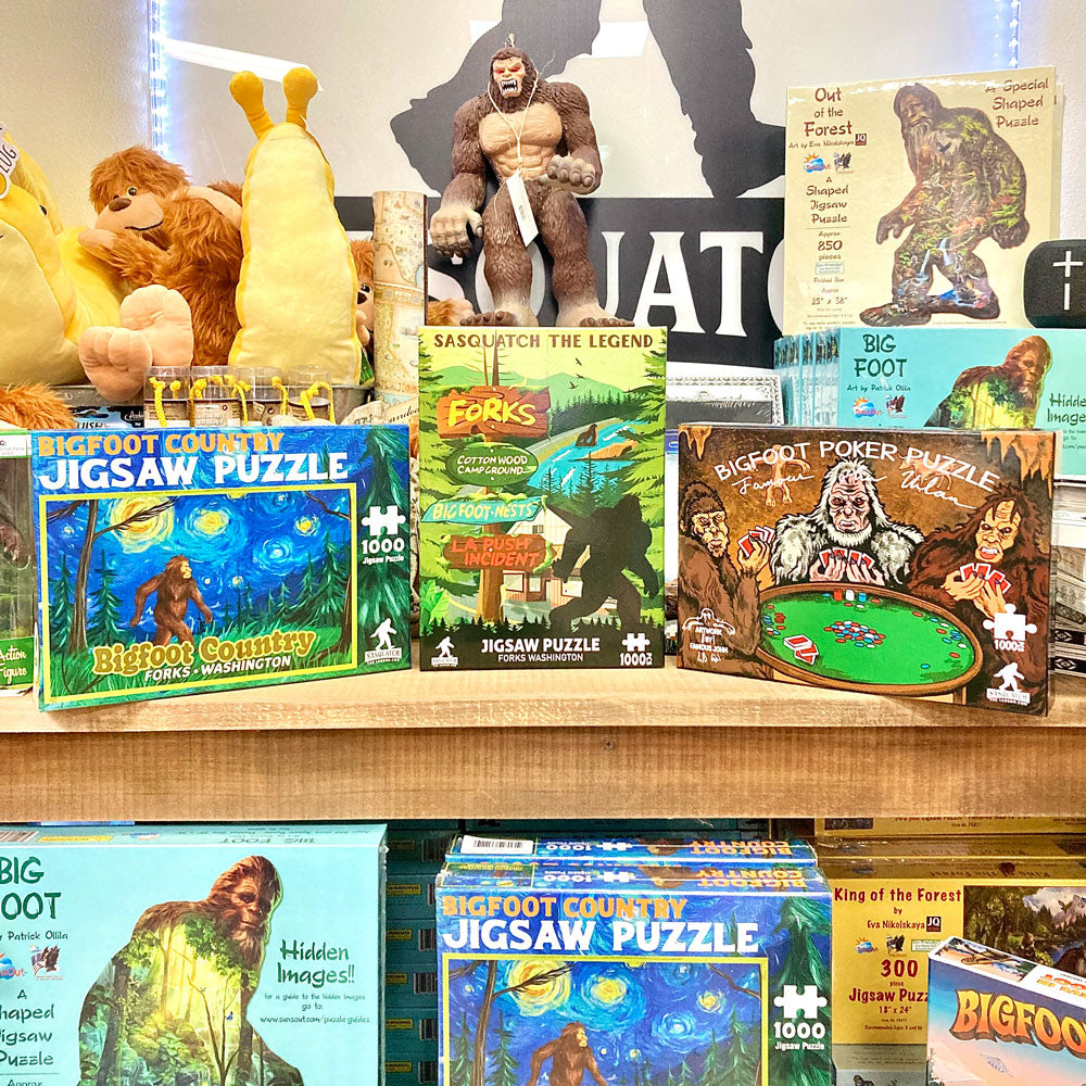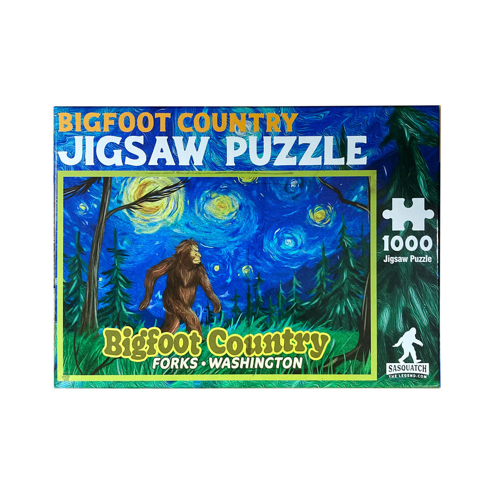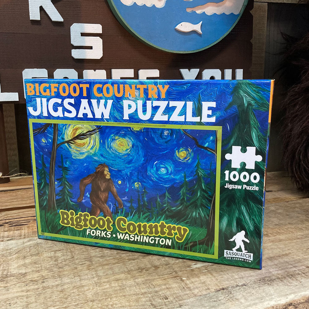 A 1000 piece jigsaw puzzle featuring Bigfoot in the famous Bigfoot Country setting in Forks Washington. A Sasquatch The Legend illustration.