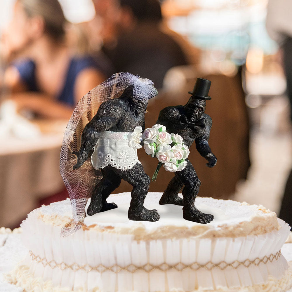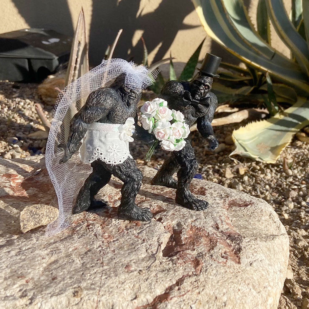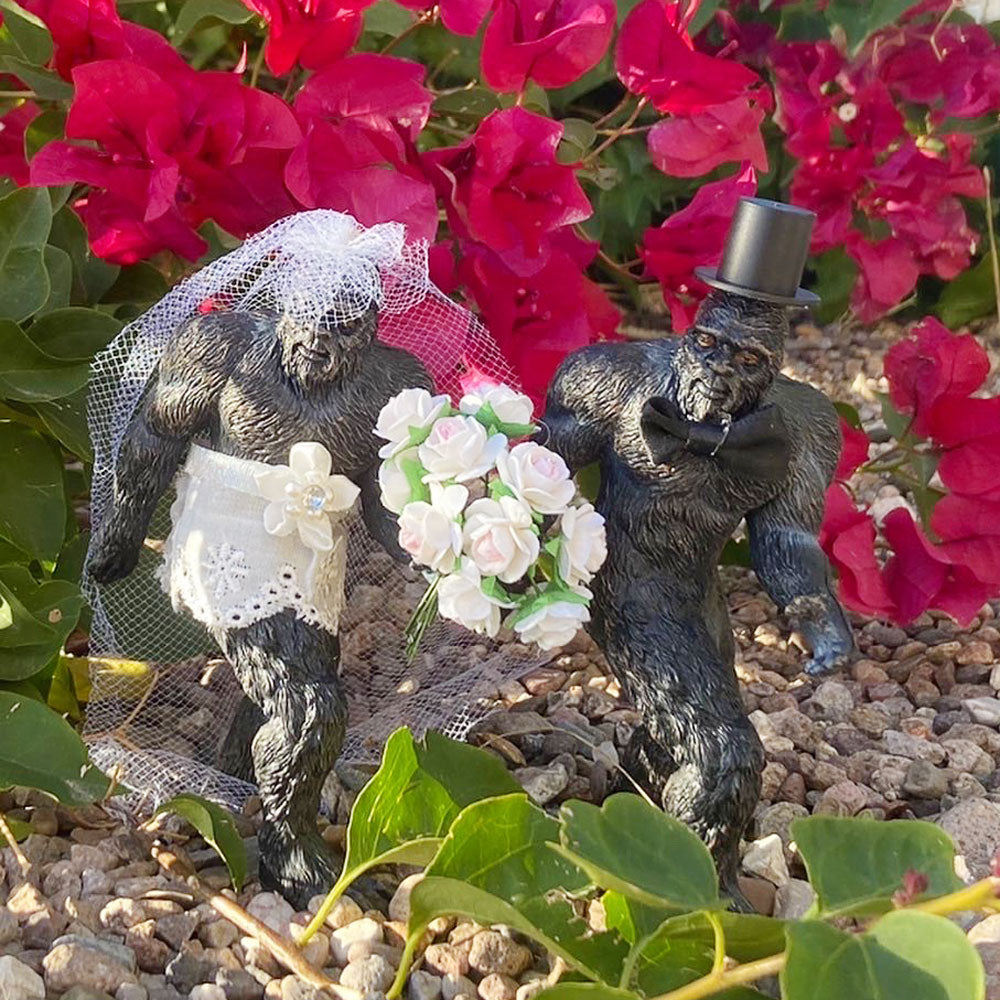 An adorable and unique Sasquatch bride and groom wedding cake topper. The bride is wearing a dress and an white wedding veil. The groom is wearing a black top hat and a black bow tie. Each Sasquatch measures 5.25 in. tall and 3.25 in wide.