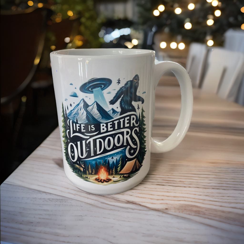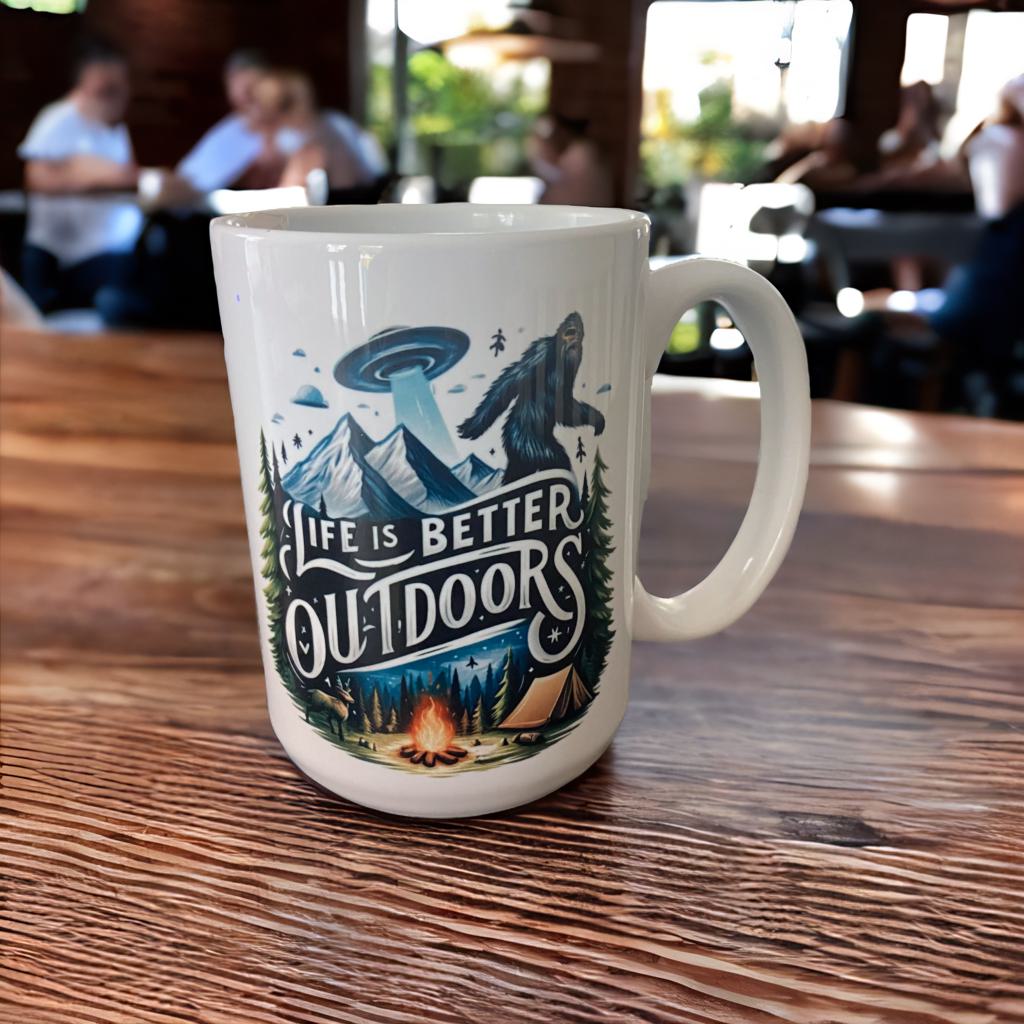 Life is Better Outdoors Bigfoot and Allien 15 oz Coffee Mug